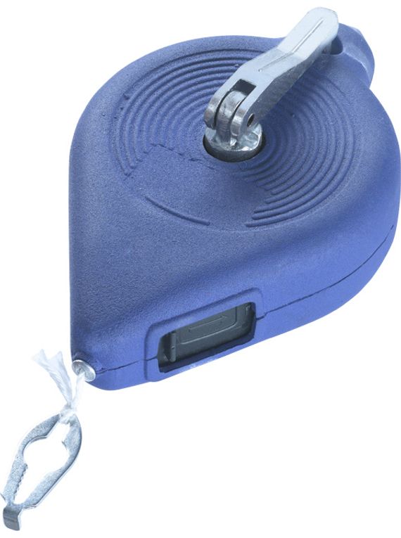 Die-cast zinc housing, with centre point, with winding handle, 30 metre line, felt buffers, supplied without chalk, for coloured marking during brick- and floor laying, partitioning etc., also for use as plumb line and gradient measure.