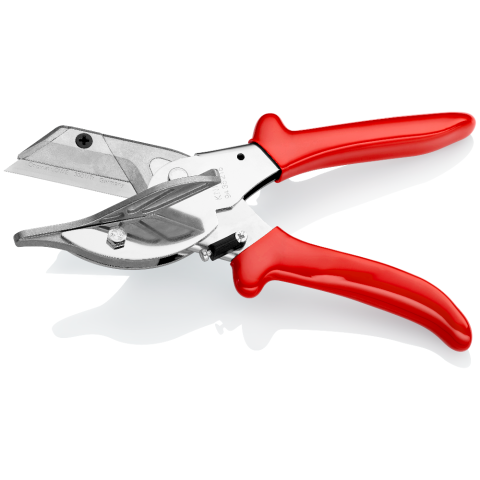 - Exchangeable cutting base with try square for 45°-cuts and markings for 60°-, 75°-, and 90°-cuts