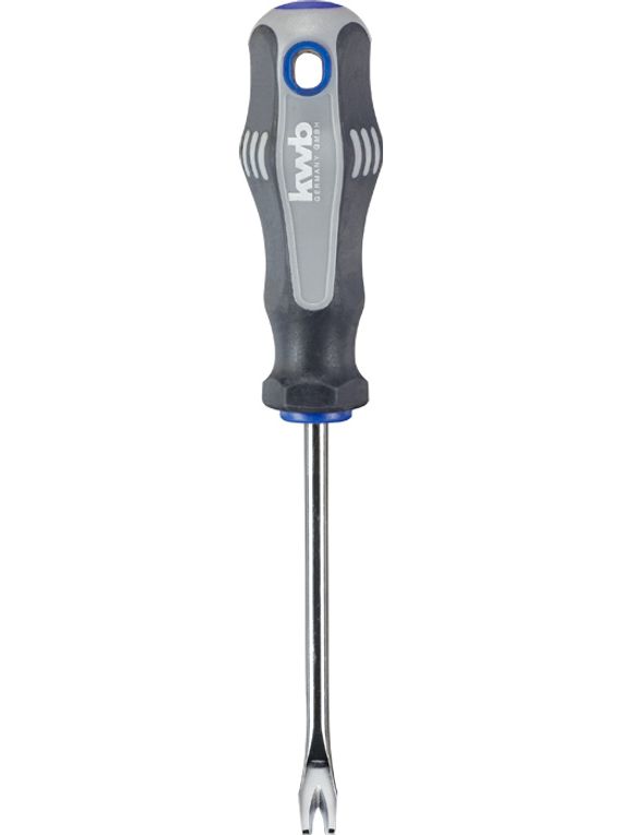 CrV steel, 3-component grip for optimal power transfer and slip-free working, matt chrome plated, with chemically blacked precision tips, with shovel for nails up to a shaft diameter of 2.5 mm. Quickly distinguishable colour code system shows the desired blade shape. With practical screwdriver holder for the workshop, simply screw the plastic clip on the workshop wall.