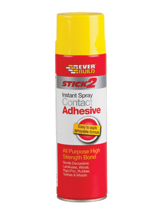 Stick 2 Spray Contact Adhesive is a sprayable glue which bonds to most common materials including wood, concrete, stone, tiles, rubber, foam, metals, rigid plastics, canvas fabrics, cardboard, paper and cork.