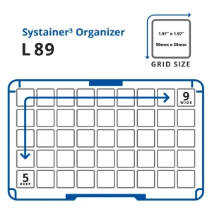 The TANOS Systainer³ Organizer L 89 keeps small components organized and accessible with a clear lid for visibility. Its grid system can secure our small boxes during transit, even when held sideways by the handle. Perfect for keeping hardware safe and easy to find on the go! This unit has no insert boxes.